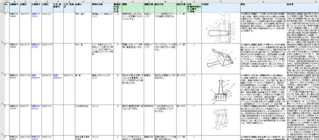 中級編の検索式立案事例で紹介した「ダブルクリップ」の特許調査により抽出された関連特許の一覧表の作成例を図1に示しました。