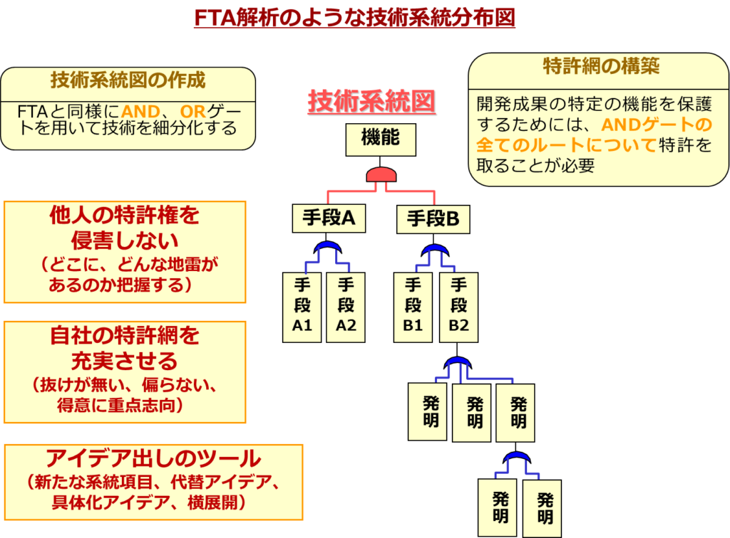 技術系統分布図の「半月」の記号は「ANDゲート」と呼ばれ、「三日月」の記号は「ORゲート」と呼ばれています。すなわち、ANDゲートの下にぶら下がる手段は全て必須となりますが、ORゲートにぶら下がる手段は、いずれかの手段で良いということになります。