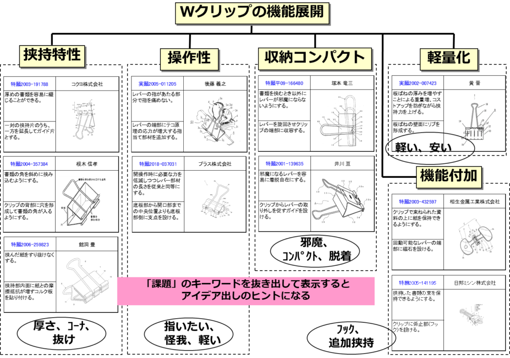 マップ化した10件の関連特許には「書類厚さ対応、書類角部対応、抜け対策」「指が痛い、ケガする、レバー開放が重い」「レバーが邪魔になる、レバーを脱着したい」「軽い、安い」「追加挟持、吊下げフック」といった課題が記載されていました。これらの課題のキーワードを抽出し技術系統図に追記しておくと、アイデア創出時の着想のヒントになると思います。