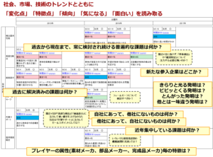 環境にやさしいカーシャンプーを開発した化学薬品メーカーでは、そのカーシャンプーの特徴である「無毒」という特徴を生かせる自動車分野以外の新たな洗浄剤の市場はどこにあるのかを洗いざらい抽出し、次なる新規洗浄剤の開発テーマを模索することにしました。