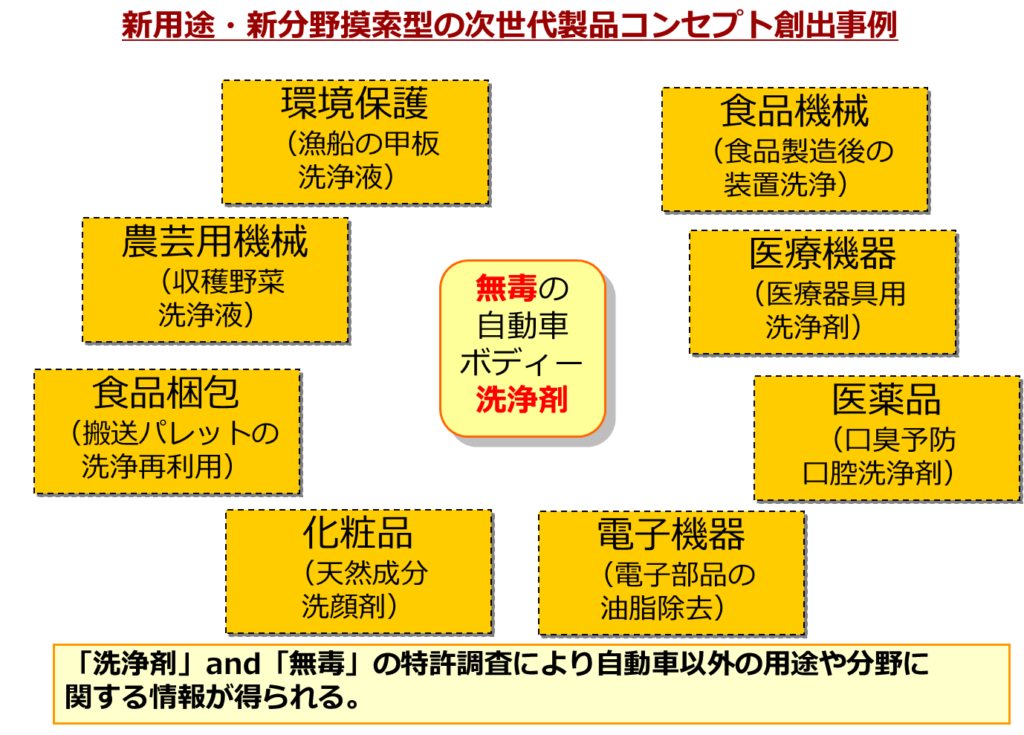 「洗浄剤 and 無毒」という検索条件で特許調査を行うと、農業機械、化粧品、医療機器、食品機械など、自動車分野以外の分野とその用途に関する情報が得られます。これらの特許情報により得られた分野と用途の情報をトリガーとしてブレインストーミングを実施し、更なる新分野、新用途に関するアイデアを創出します。例えば、「食品製造後の装置の洗浄」という既知アイデアに触発されて、「食品梱包時の搬送パレットの洗浄再利用に使える」といった新たなアイデアが創出されるのです。